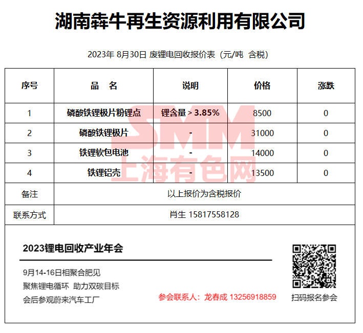 8月30日湖南犇牛 废锂电回收报价