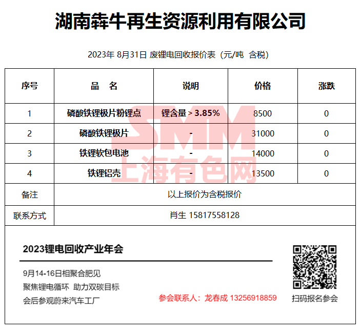 8月31日湖南犇牛 废锂电回收报价