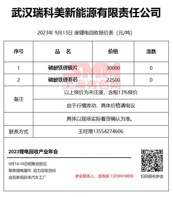 9月13日武汉瑞科美 废锂电回收报价