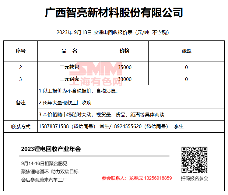 9月18日广西智亮 废锂电回收报价