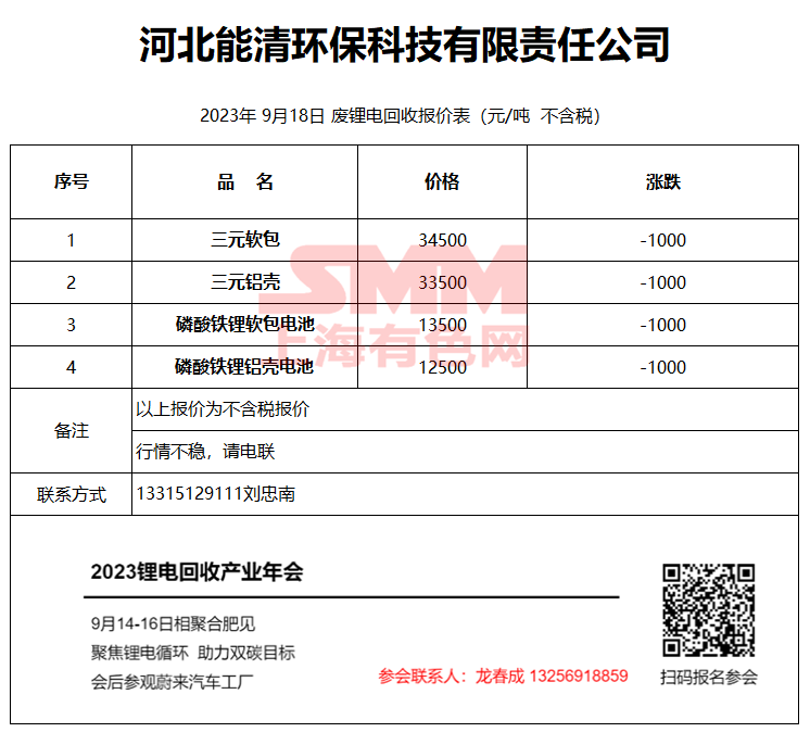 9月18日河北能清 废锂电回收报价