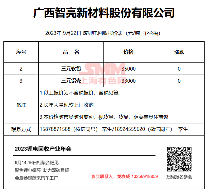 9月22日广西智亮 废锂电回收报价