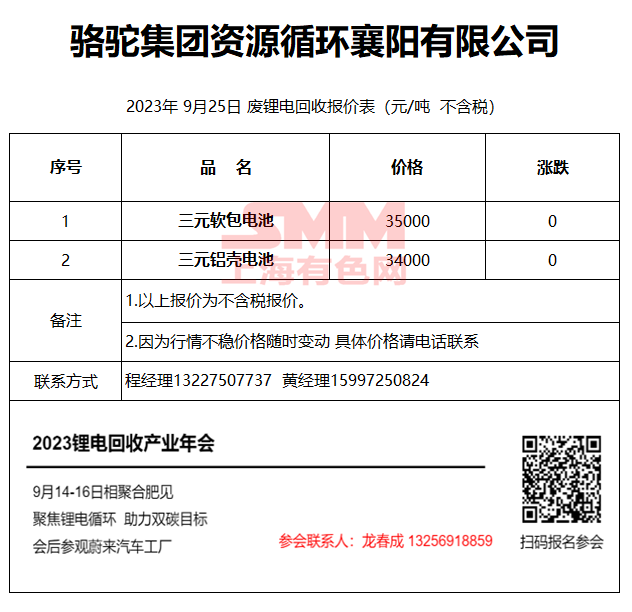 今日骆驼集团,废锂电回收报价已更新,有货的朋友欢迎联系我们!