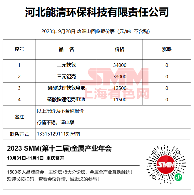 9月28日河北能清 废锂电回收报价
