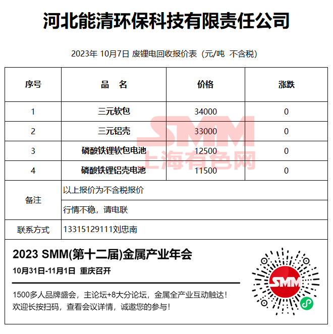 10月7日河北能清 废锂电回收报价
