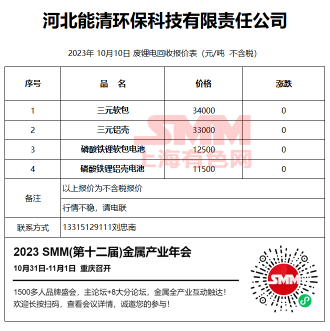 10月10日河北能清 废锂电回收报价