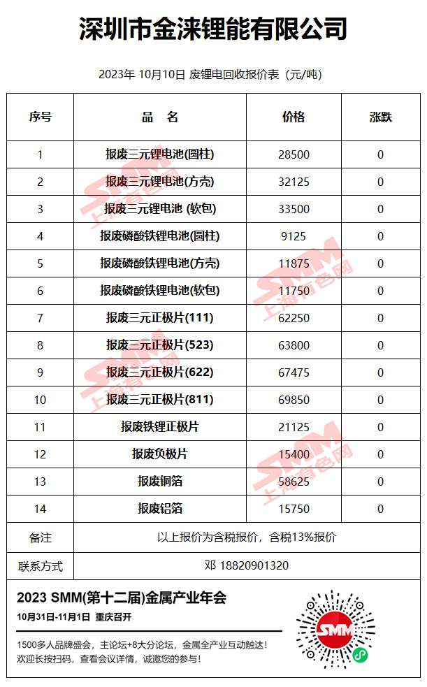 10月10日深圳金涞 废锂电回收报价