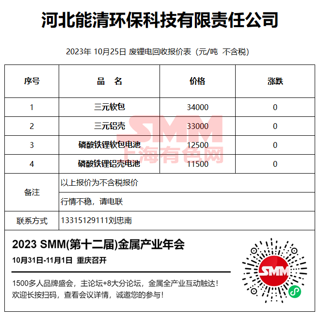 10月25日河北能清 废锂电回收报价