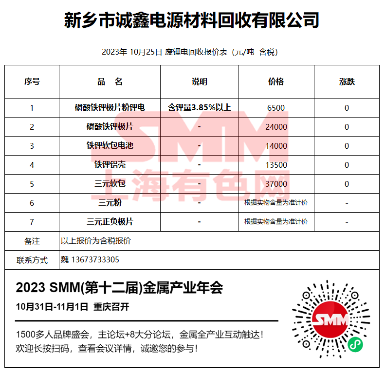 10月25日新乡诚鑫 废锂电回收报价