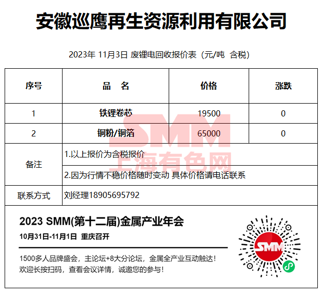 11月3日安徽巡鹰 废锂电回收报价