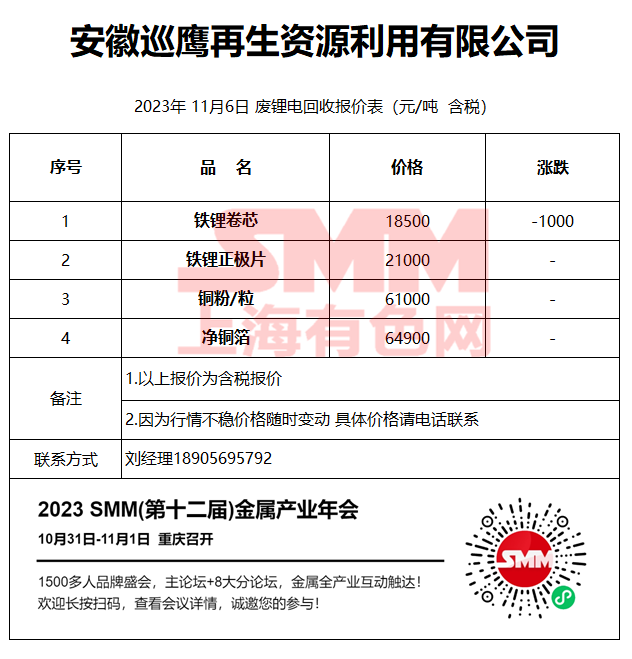 11月6日安徽巡鹰 废锂电回收报价