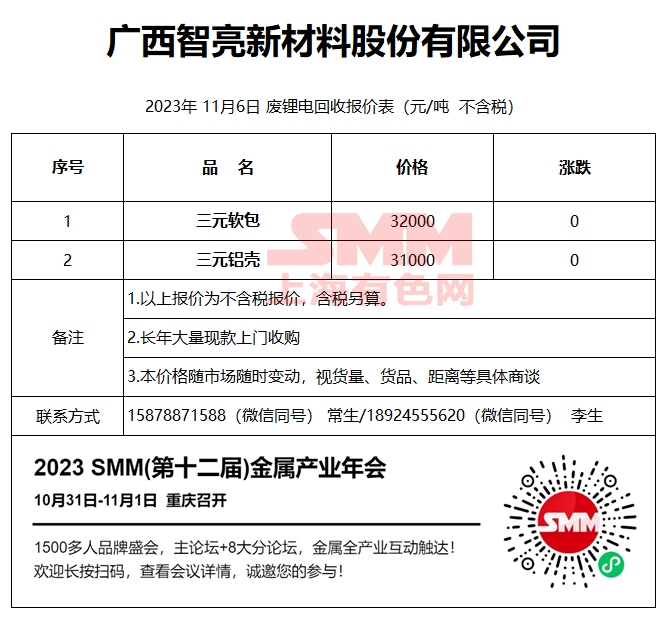 11月6日广西智亮 废锂电回收报价