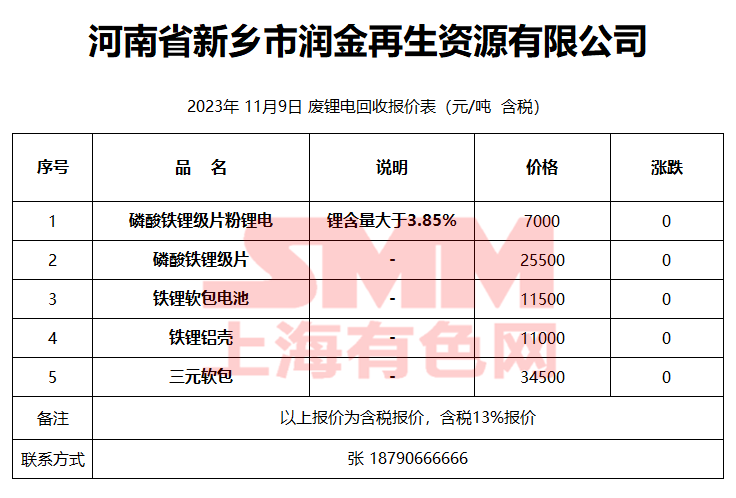 11月9日河南润金 废锂电回收报价