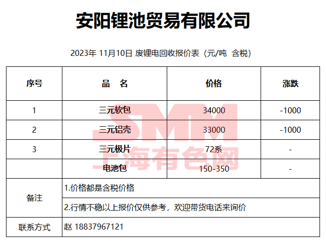 11月10日安阳锂池 废锂电回收第二次报价