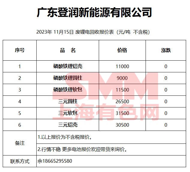 11月15日广东登润 废锂电回收报价