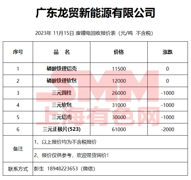 11月15日广东龙贸 废锂电回收报价