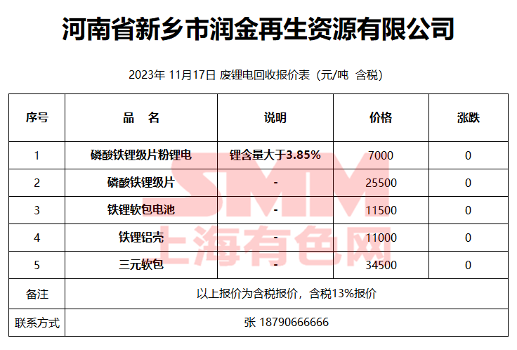 11月17日河南润金 废锂电回收报价
