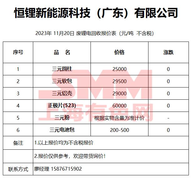 11月20日广东恒锂 废锂电回收报价