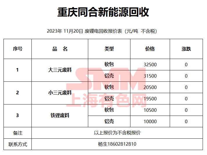 11月20日重庆同合 废锂电回收报价