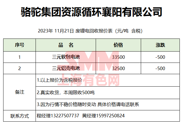 11月21日骆驼集团 废锂电回收第二次报价