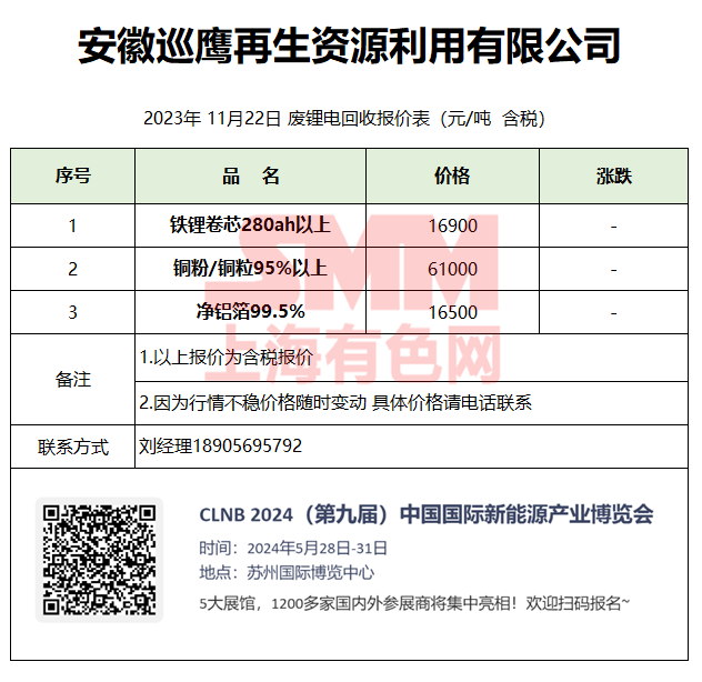 11月22日安徽巡鹰 废锂电回收报价