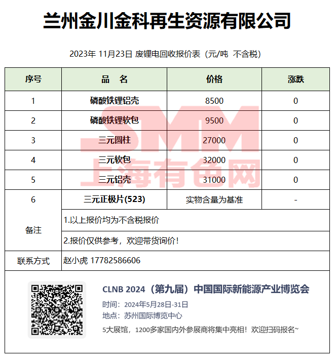 11月23日金川金科 废锂电回收报价