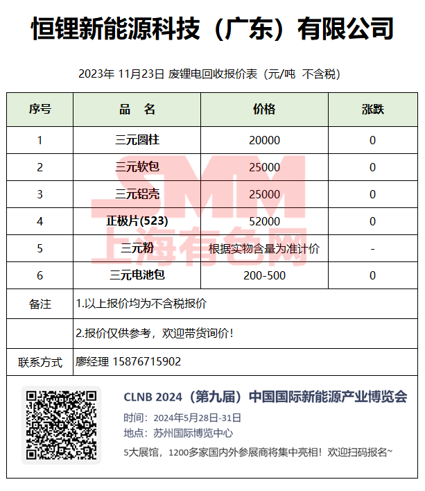11月23日广东恒锂 废锂电回收报价