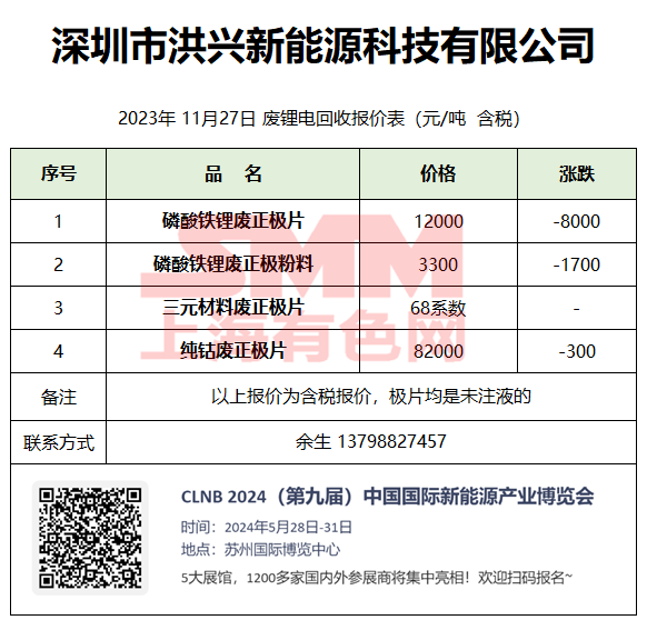 11月27日深圳洪兴 废锂电回收报价