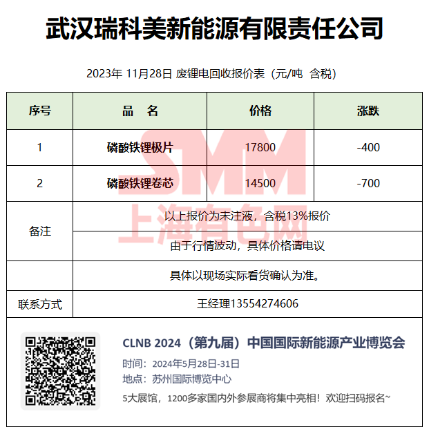 11月28日武汉瑞科美 废锂电回收报价