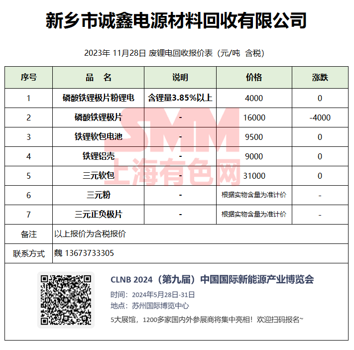 11月28日新乡诚鑫 废锂电回收报价