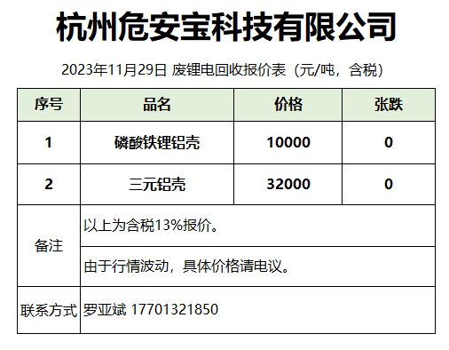 11月29日杭州危安宝 废锂电回收报价