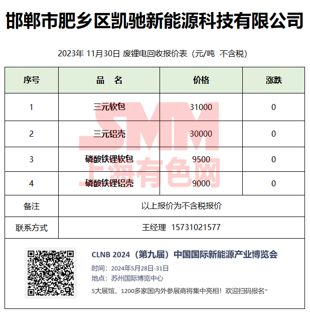 11月30日邯郸凯驰 废锂电回收报价