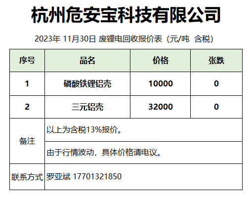 今日杭州危安宝,废锂电回收报价已更新,有货的朋友欢迎联系我们!