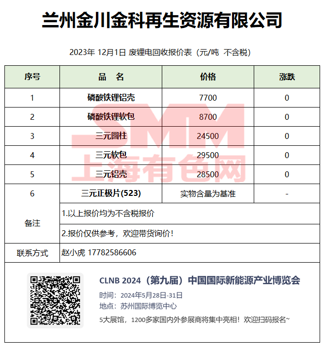 12月1日金川金科 废锂电回收报价