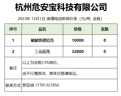 今日杭州危安宝,废锂电回收报价已更新,有货的朋友欢迎联系我们!