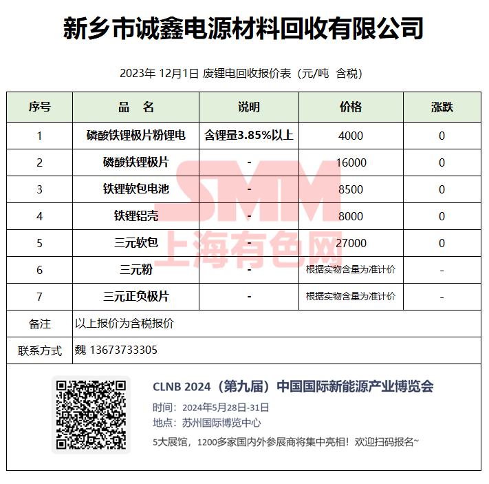 12月1日新乡诚鑫 废锂电回收报价