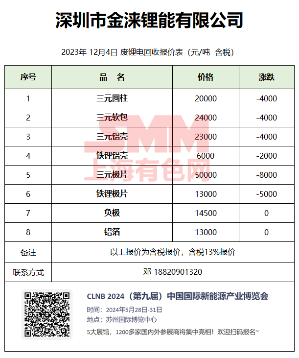 12月4日深圳金涞 废锂电回收报价