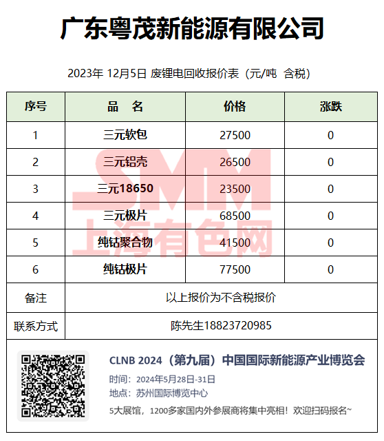 12月5日广东粤茂 废锂电回收报价