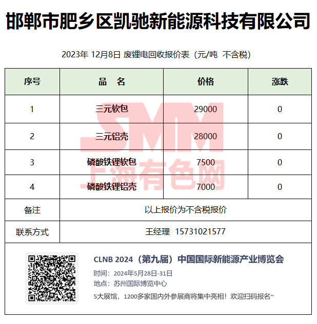 12月8日邯郸凯驰 废锂电回收报价