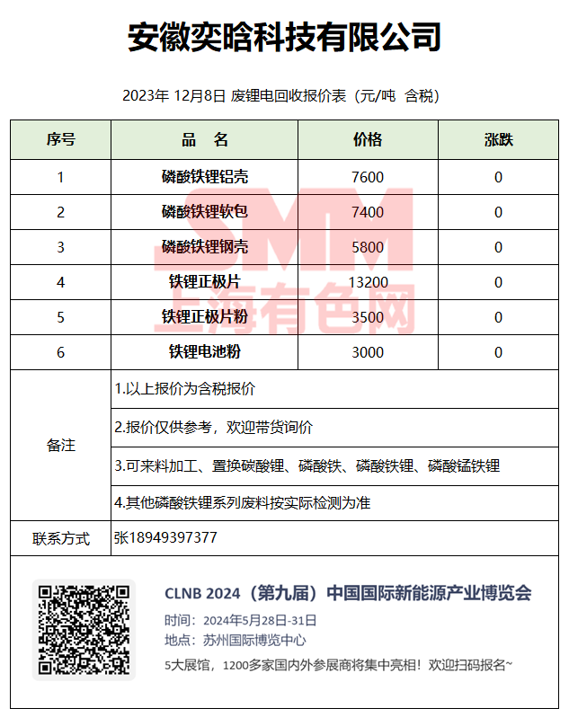 12月8日安徽奕晗 废锂电回收报价