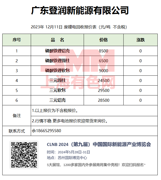12月11日广东登润 废锂电回收报价