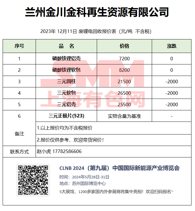 12月11日金川金科 废锂电回收报价