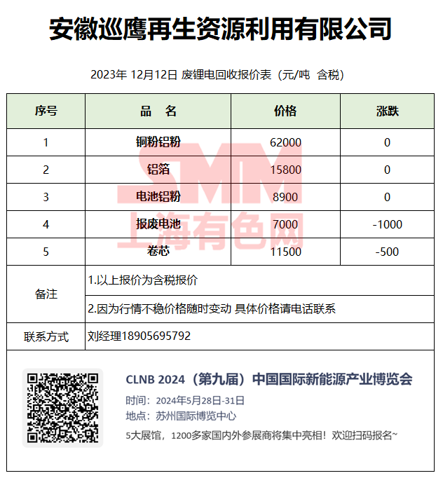 今日安徽巡鹰,废锂电回收报价已更新,有货的朋友欢迎联系我们!