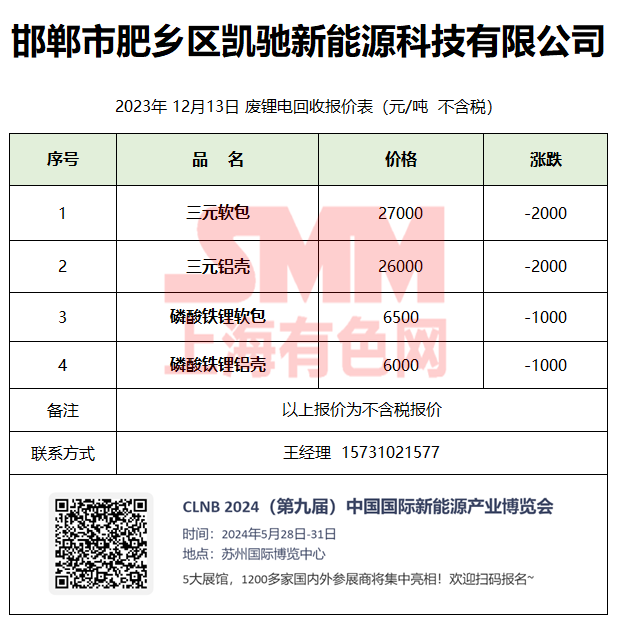 12月13日邯郸凯驰 废锂电回收报价