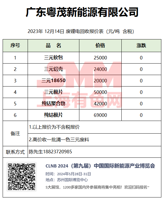 12月14日广东粤茂 废锂电回收报价