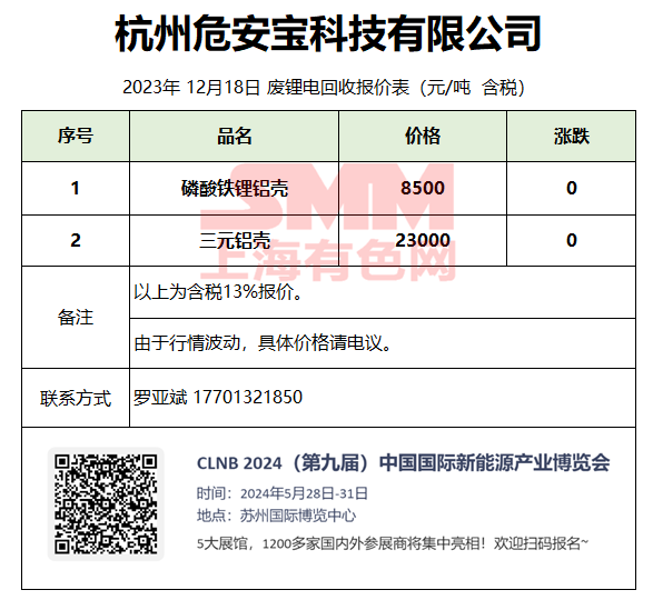 今日杭州危安宝,废锂电回收报价已更新,有货的朋友欢迎联系我们!