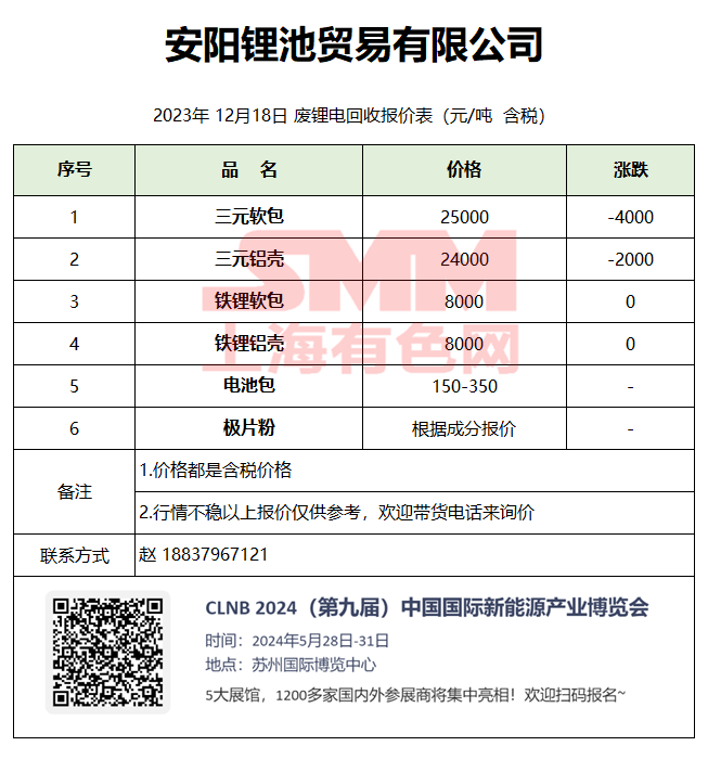 12月18日安阳锂池 废锂电回收报价