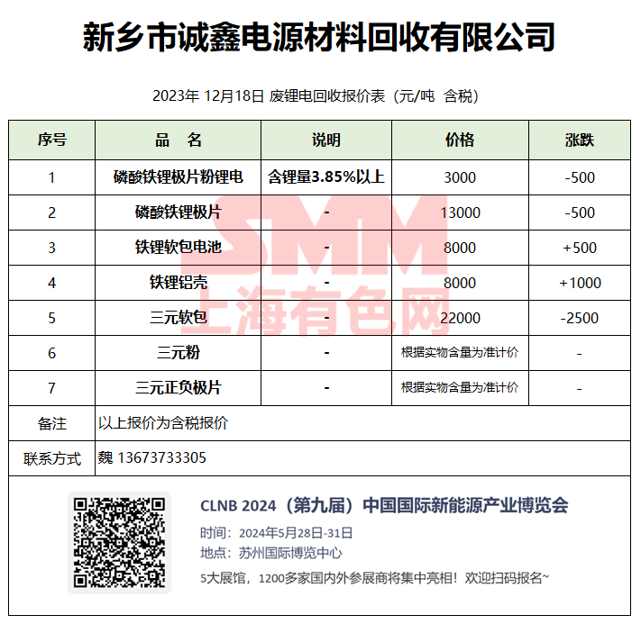 今日新乡诚鑫,废锂电回收报价已更新,有货的朋友欢迎联系我们!