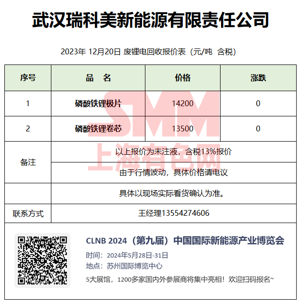 12月20日武汉瑞科美 废锂电回收报价