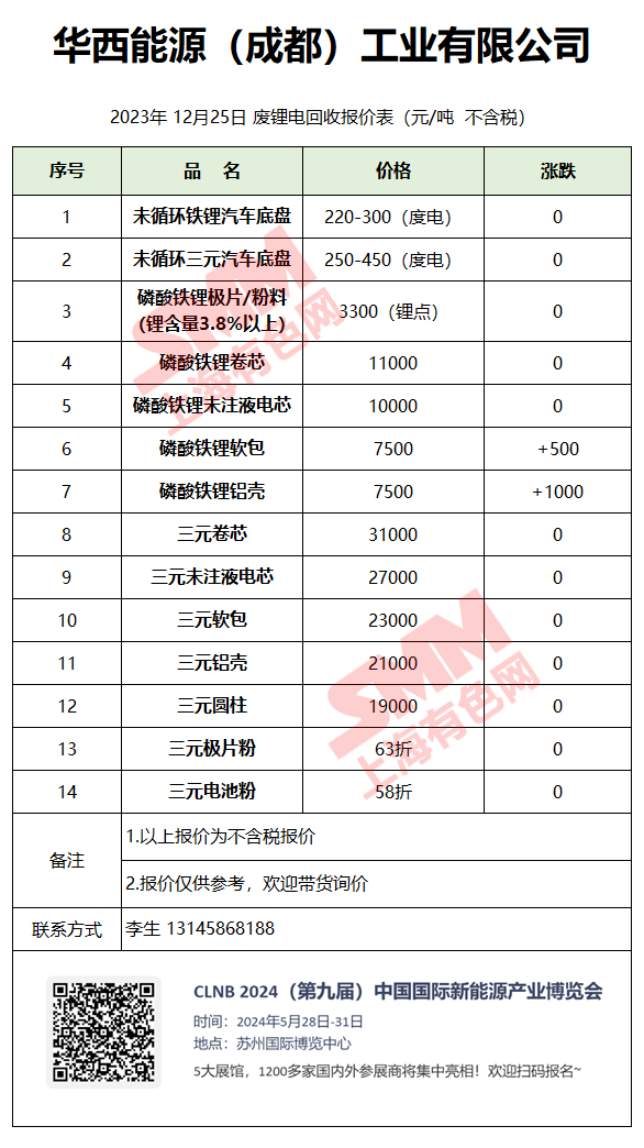 今日华西能源(成都),废锂电回收报价已更新,有货的朋友欢迎联系我们!